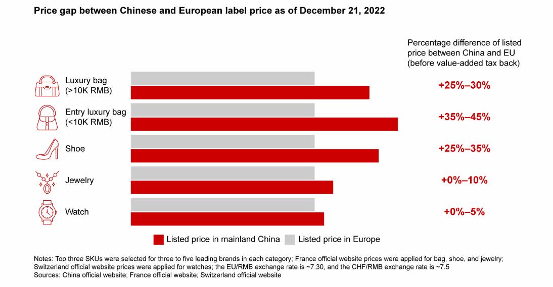 对包袋品类的抽检中发现,在不计增值税(10%~12%)的情况下,一件商品在中国和欧洲之间的价差为25%~45%。入门级(entry-level)商品的价差距大于更昂贵的商品。