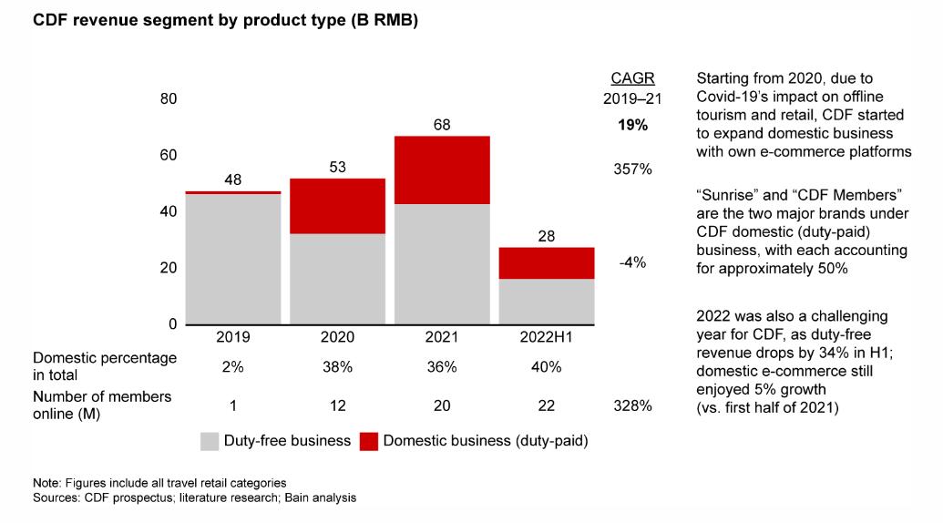 与此同时,中国免税集团(CDFG)及其附属公司一直在积极推动国内电商渠道的发展,以抵消因航空旅行受限而造成的销售额下滑。从2020年开始,中国免税集团开始通过自有电商平台拓展国内业务,“Sunrise(日上VIP会员)”和“CDF 会员购”是中国免税集团国内完税业务的两大主要渠道,销售额各占约50%。