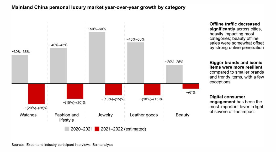 线下购物受到较大打击,所有奢侈品类别都不同程度地受到市场下滑的影响,但在线渗透率(online penetration)高的品类受疫情管控影响较小,表现较好。例如,在线渗透率为50%的奢侈美容品类,仅收缩了6%。