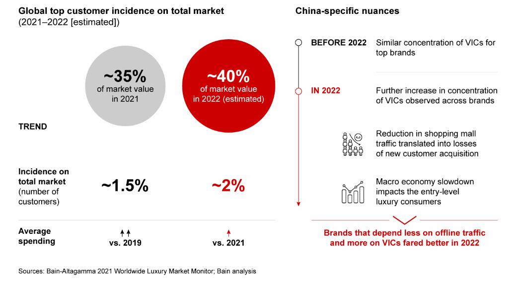 经济放缓对入门级奢侈品消费者的影响超过了高净值人士(HNWIs)受到的影响,导致品牌在新客户获取方面有所下降,再加上由于疫情管控导致商场客流量下降,品牌2022年销售额更多地由 VIC 创造。一些中国奢侈品牌 VIC 客户的消费额在2022年的增幅高于40%的全球平均水平。