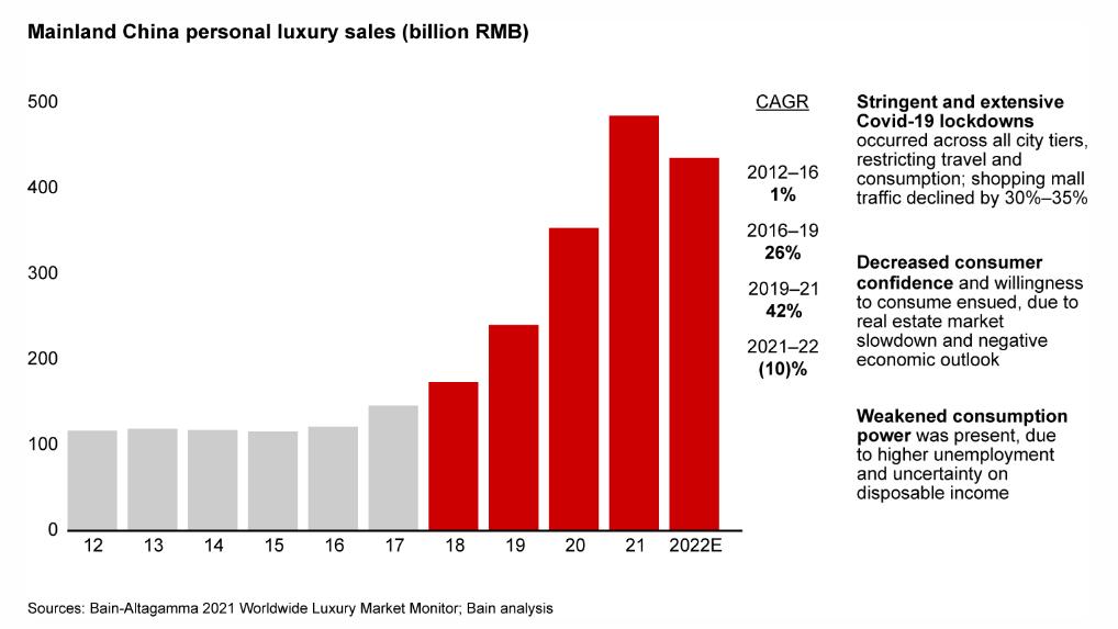 2月7日,贝恩咨询公司(Bain & Company)发布了有关中国大陆奢侈品市场的最新报告《Setting a New Pace for Personal Luxury Growth in China(中国个人奢侈品市场增长的新步伐)》。数据显示,2022 年,中国大陆个人奢侈品销售额结束了连续五年的指数增长,同比下降10%。不过,贝恩估计,这一低迷情况预计将在2023年第一季度结束前恢复。